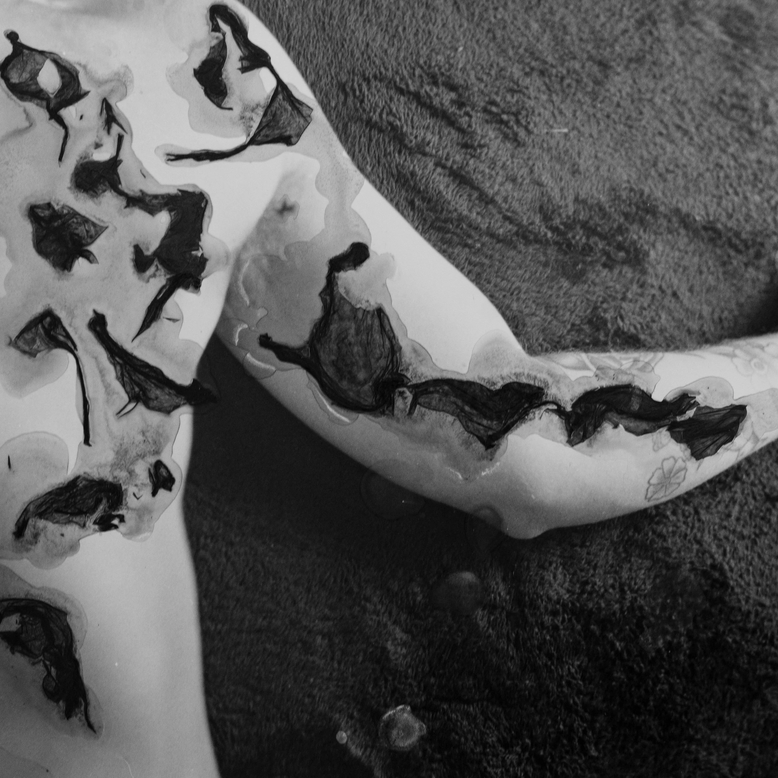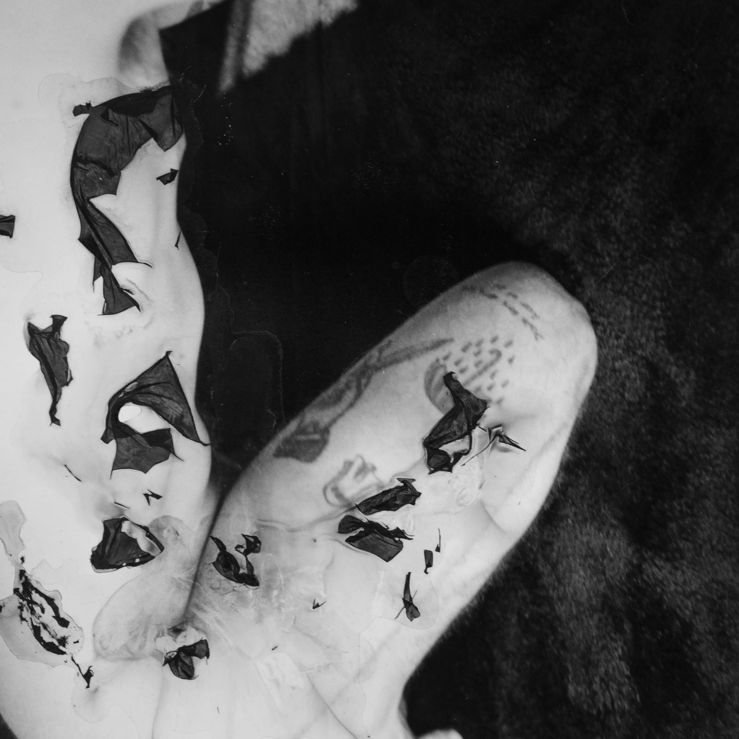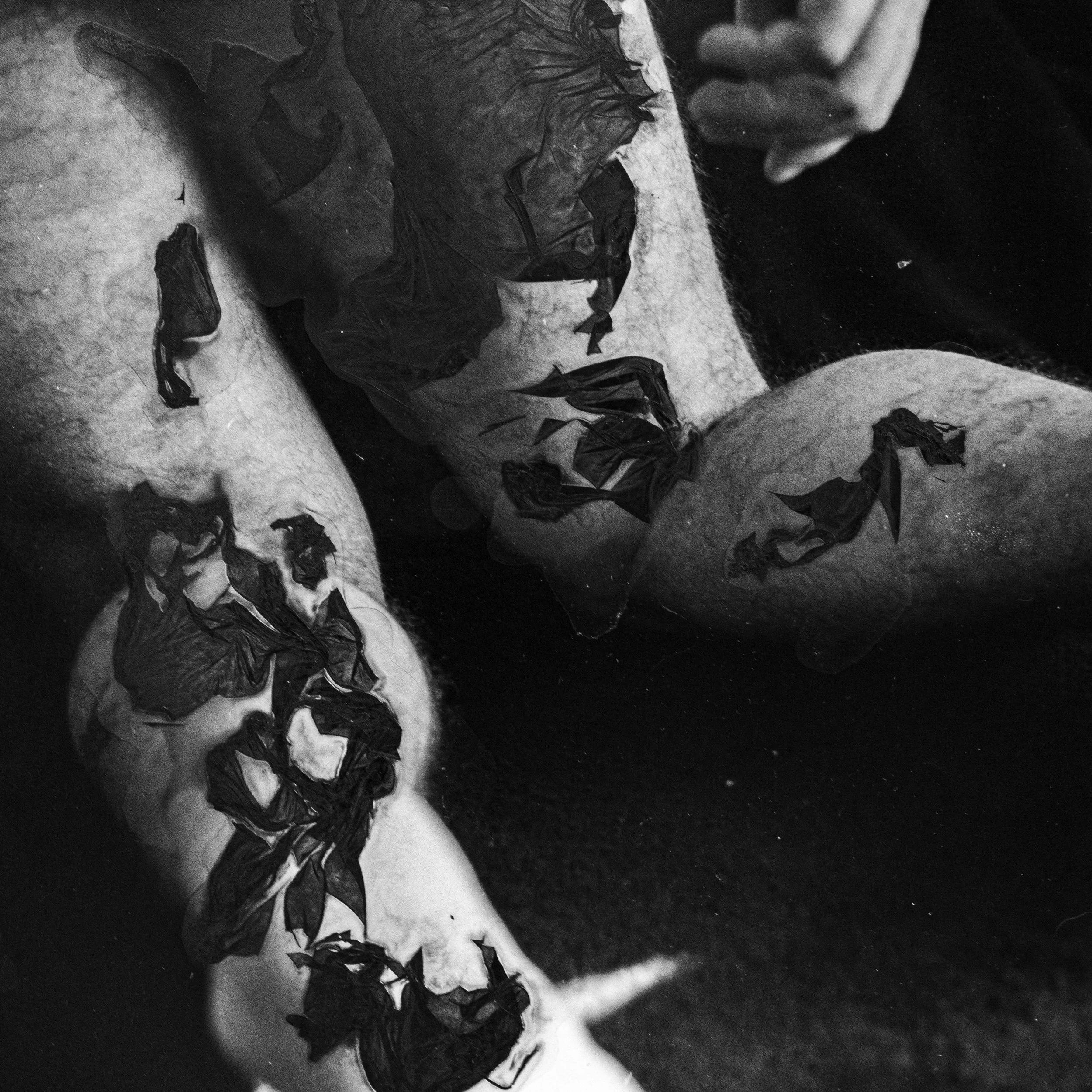 During the creation of Positives Left Behind I explored the act of creation as a form of conceptual expression. Exploring the themes of intimacy and vulnerability I used the mordançage process to float the image laced membrane of a photographic print of the surface of water. I then had to carefully remove these veils and delicately place them upon myself where dried and became apart of my image and thus a part of me.